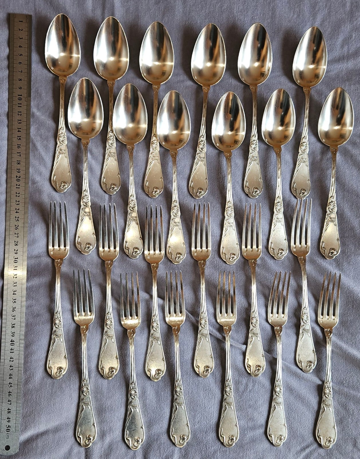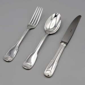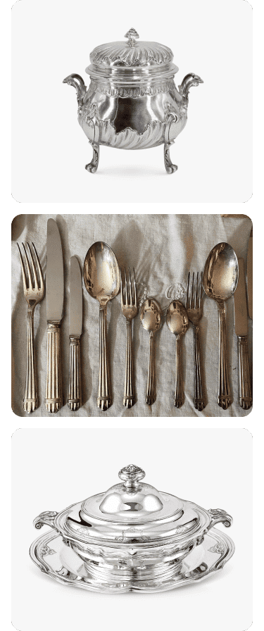 Le métal argenté regroupe principalement des couverts, pièces de forme, plateaux et objets décoratifs recouverts d’une fine couche d’argent. Sa valeur repose essentiellement sur le poids et la catégorie des objets, et non sur la présence d’argent massif.